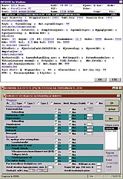 Vi har så langt utviklet en fullstendig integrert ”diabetesmodul” i samarbeid med programvareselskapene Legedata AS og Infodoc AS. Det er gjort avtale med Profdoc AS som den tredje journalleverandøren i norsk allmennpraksis og en tilsvarende løsning vil være klar i løpet av 3. kvartal 2000. Disse løsningene er tilpasset det brukermiljø som disse leverandørene ellers er kjent for og gir ikke legene noe fremmed inntrykk når registreringsbildene kommer opp. De forskjellige brukergrensesnitt gir imidlertid som registreringsresultat nøyaktig samme datasett for eksport. Skjermbildene er utviklet av leverandørene i tett samarbeid med DiabCare Norge, SATS og utvalgte allmennpraktikere i en prepilotfase. Eksempel som viser de to registreringsbildenes forskjellige brukergrensesnitt (Infodoc AS og Legedata AS) er gjengitt i figur 2. Alle data i registreringen som kan hentes fra andre deler ev den elektroniske journalen (demografiske fakta, laboratoriedata og medikasjon) blir automatisk overført og registrert fra den elektroniske journalen og delvis lagt inn i skjermbildet. Resten av dataene fylles inn av legen under konsultasjonen eller i løpet flere konsultasjoner innenfor en 12-månedersperiode.