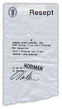 Før sommeren sendte firmaet, som kaller seg Norman Datalegesenter, en “resept” (se faksimilen) med tilbud om virusprogramvare til kundene. Øverst på resepten er det trykt en figur som til forveksling er lik legeforeningslogoen. Den eneste forskjellen er at inskripsjonen “Den norske lægeforening” er erstattet med “Den norske datavirusforening” og at årstallet 1886 er byttet ut med 1986.