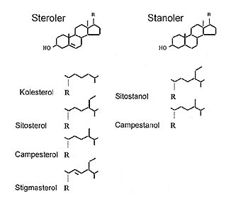 Plantesteroler dannes naturlig i planter, og minst 44 ulike plantesteroler er identifisert. Frie plantesteroler inngår i plantecellemembraner og i strukturer. Esterifisert plantesterol har lagringsfunksjon i cytosol, som dråper og vesikler. Strukturen er svært lik kolesterolets struktur, bortsett fra små variasjoner i sidekjeden (fig 1) (14). Det finnes både umettede og mettede plantesteroler, hvorav de umettede plantesterolene er vanligst forekommende i naturen. Hovedtypene av de umettede formene er β -sitosterol, campesterol og stigmasterol. De tilsvarende mettede formene heter henholdsvis β -sitostanol, campestanol og stigmastanol (15 – 17). Disse finnes i små mengder i naturen, men kan dannes gjennom hydrogenering av de umettede formene.