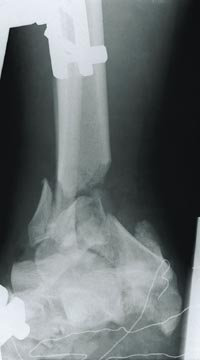Pasienten fikk primær behandling for sine brudd, og det ble utført fasciotomier (høyre underarm, høyre legg). Under inngrepene på høyre humerus ble n. radialis skadet. Respiratorbehandlingen ble seponert etter åtte døgn. Etter oppvåkning ble det ved nevrologisk undersøkelse påvist total paralyse i høyre underekstremitet og venstresidig radialisparese. Det var redusert sensibilitet distalt for høyre kne og ingen fremkallbare reflekser i underekstremitetene. Han hadde senere amnesi for de første 2 – 3 ukene og var forvirret og uklar i ca. sju uker etter skaden. Det oppstod infeksjon i venstre hæl pga. den uttalte knusningsskaden. Pga. av dette og manglende muligheter for å gjenskape anatomiske forhold ble det gjennomført crusamputasjon 11 dager etter ulykken.