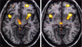 PET (positronemisjonstomografi)-undersøkelser har nylig vist en aktivering av hypothalamus på smertesiden under anfall med clusterhodepine (21). Man kunne lokalisere dette området til grå substans i hypothalamus, svarende til nucleus suprachiasmaticus (hvor biorytmer genereres) (fig 1) (22). Dette området blir ikke aktivert ved andre smertetilstander, som for eksempel migrene, og ikke etter injeksjon av capsaicin i pannen. Man så heller ikke slik aktivering i remisjonsfasen. Senere har man vist tilsvarende funn under et spontant anfall (Goadsby PJ, personlig meddelelse). Nylig har MRI-basert morfometri vist strukturelle forandringer i hypothalamus i det samme området (23).
