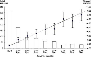 Som forventet var det en klar relasjon mellom SAPS II-skåre og sykehusmortalitet i gruppen av ikke-hjerteopererte pasienter. Av våre intensivpasienter var 30 % innlagt etter hjertekirurgi. Det er en kategori pasienter som skåringssystemet SAPS II ennå ikke er validert for. Vi har likevel valgt å skåre denne pasientgruppen fordi vi har ønsket full oversikt over fordelingen av SAPS II-skåre i vårt pasientmateriale. Det er vårt inntrykk at det også er en klar sammenheng mellom økende SAPS II-skåre og mortalitet for hjerteopererte som fikk intensivbehandling. Sett fra vår avdelings side er det en ulempe at det skåringssystemet vi av Helsetilsynet er blitt oppfordret til å anvende, ikke er validert for en så stor andel av de pasientene vi behandler.