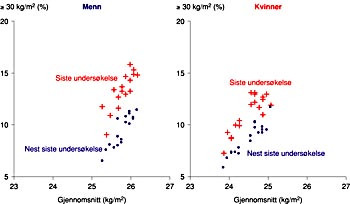 I figur 1 er gjennomsnittsverdiene for kroppsmasseindeks plottet mot andelen med kroppsmasseindeks 30 kg/m². For både menn og kvinner er sammenhengen like sterk i de to undersøkelsesperiodene. Estimering av en regresjonslinje for menn viste at en forskjell i gjennomsnittlig kroppsmasseindeks på 1 kg/m² tilsvarte en forskjell i andelen med fedme på fem prosentenheter. Tilsvarende for kvinner var det fire prosentenheter. Uttrykt på en annen måte – en gjennomsnittsøkning i kroppsmasseindeks på 0,20 – 0,25 kg/m² forventes å gi en økning i andelen med fedme på ett prosentpoeng.
