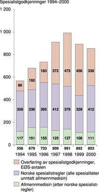 De fleste konverterte spesialistgodkjenninger i 2000 er i fagene allmennmedisin (81), anestesiologi (33), indremedisin (30), generell kirurgi (25), ortopedisk kirurgi (25), fødselshjelp og kvinnesykdommer (18), psykiatri (15), barnesykdommer (12), radiologi (11), og hjertesykdommer (10).