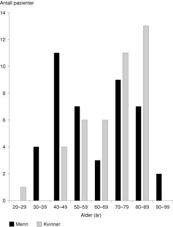 87 pasienter ble operert for ulcus perforatum i løpet av perioden. Data forelå fra 84 pasienter, hvorav 43 menn. Median alder ved operasjonstidspunktet var 69 år (spredning 20 – 92 år). Kjønns- og aldersfordeling er vist i figur 1.
