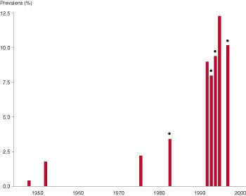 De allergiske sykdommer er blant vår tids typiske og hyppigste sykdommer. Allergi finnes hos en tredel av befolkningen (1), i enkelte undersøkelser endatil hyppigere, som rapportert fra vårt nordligste fylke (2, 3). Astma er den mest dramatiske og mest omtalte av de allergiske sykdommer, og den hyppigste årsak til sykehusinnleggelse hos norske barn (4). Det er påvist en markant økning i forekomsten av astma i etterkrigstiden, som i første rekke har kommet til syne hos barn (4), men som også nå er rapportert blant voksne (5). Det er gjort en serie epidemiologiske undersøkelser over astmaforekomsten blant barn i vårt land. Flere er på grunn av forskjellig design vanskelige å sammenlikne, men noen er direkte sammenliknbare, med felles metoder. Disse undersøkelsene viser en jevn økning i forekomsten av astma blant barn i Norge i tiden etter siste krig (fig 1) – fra de første, publisert i 1948 (6), 1954 (7), 1978 (8) og 1985 (9), med forekomster fra 0,4 % til 3,4 %, til undersøkelser utført i 1990-årene (2, 10 – 13), med forekomster fra 8 % til 12,3 % (fig 1). Dette er helt sammenfallende med utviklingen i andre land (14), og til tross for enkelte forsøk på å forklare den rapporterte økning som økt oppmerksomhet omkring sykdommen (15), er det nå internasjonalt generell enighet om at det foreligger en betydelig økning i forekomsten av astma.