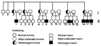 Pasient 1. Ein gut, yngst av tre brør (fig 1, II-18). Eldre bror fekk påvist låg T4 og TBG-mangel under utgreiing for kortvokster. Det var lett asfyksi under fødselen. I navlestrengsblod var det låg verdi av T4 og øvre grenseverdi for TSH. Det var ikkje påviseleg mengde TBG. TSH fall raskt, men ved oppfølging var verdiane stadig noko over det normale, i gjennomsnitt det doble av øvre normalverdi. Det var óg nokre normale målingar. ”Thyrotropin releasing hormone”-test (10 µg/kg) då guten var sju år synte TSH-respons til 5,5 gonger utgongsverdi, svarande til latent hypotyreose. FT4-verdiane var i det øvre normalområdet, dels litt over. Han har ikkje fått substitusjonsbehandling med tyroksin, og har vore klinisk eutyreot med normal lengde, vekt og psykomotorisk utvikling til 13 års alder. Røntgen har vist beinkjernealder lik kronologisk alder.