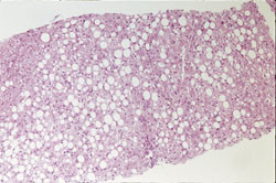 Ultralydundersøkelse og computertomografi av lever viste forandringer forenlig med steatose. Histologisk undersøkelse av leverbiopsi viste betydelig steatose og moderat nekroinflammasjon (fig 3) (tab 2). Det var ikke holdepunkt for viral eller autoimmun leversykdom (tab 1).