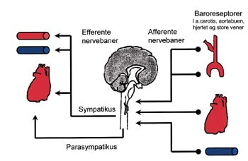 Den delen av det autonome nervesystemet som styrer blodtrykk og hjertefrekvens, består av to komplementære deler (fig 1). Efferent sympatisk aktivitet fører til at noradrenalin og adrenalin skilles ut fra sympatiske nerveterminaler og binyremargen. Katekolaminene stimulerer adrenerge betareseptorer på hjertemuskelcellenes overflate. Dette får hjertet til å kontrahere kraftigere og hjertefrekvensen til å øke (1). Adrenalin og noradrenalin inaktiveres ved opptak i cellene for metabolisering, plassering i lagringsvesikler eller ved utskilling i urin (1). Efferent parasympatisk aktivitet gjør at acetylkolin frisettes fra de vagale intrakardiale gangliene. Denne nevrotransmitteren binder seg til muskarinreseptorer i hjertet. Stimulering av disse reseptorene hemmer bl.a. depolariseringshastigheten i sinusknuten og bremser atrioventrikulær overledningstid slik at hjertefrekvensen reduseres (2). Acetylkolin inaktiveres av acetylkolinesterase få sekunder etter frisetting (1, 3).