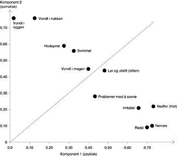 Det andre problemet er å formulere spørsmålene slik at det er noenlunde entydig om man tenker på psykiske eller somatiske plager. Det å være ”lei og utslitt (sliten)” kan både dreie seg om en kroppslig form for utmattelse og om en mer psykisk form. Det samme gjelder ”problemer med å sovne”, som kan være forårsaket av en kroppslig eller av en mer psykisk form for uro. Det viste seg da også at det i den prinsipale komponentanalysen var disse to av de psykiske plagevariablene som plasserte seg nærmest opp mot de somatiske. I praksis kan det likevel være vanskelig å skille klart mellom psykiske og somatiske plager. Kanskje finnes det plager som så å si hører hjemme i grenselandet mellom det psykiske og det somatiske, og at disse best fanges opp nettopp når spørsmålene på dette punktet formuleres tvetydig?