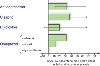- Mange pasienter med funksjonell dyspepsi trenger ingen annen behandling enn en beroligende forklaring. Medikamentell behandling vil hos de fleste ikke ha noen effekt