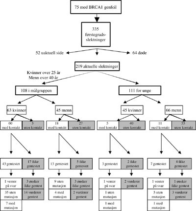 De 75 indekspersonene + 63 kvinner + 45 menn, viste seg å tilhøre 22 familier. Vi fjernet den i familien som først hadde fått påvist mutasjon fra videre beregninger. Det var da 100 kvinnelige slektninger over 25 år tilbake i disse 22 slektene. Vi hadde allerede kontakt med 97 (97 %) av disse. Tilsvarende var det 57 mannlige slektninger over 40 år, og vi hadde allerede kontakt med 30 (53 %) av dem. Figur 1 gir en detaljert oversikt.