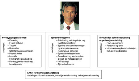 Sosial- og helsedirektoratet er en nyskapning fra 1.1. 2002 og ledes av direktør Bjørn-Inge Larsen. Direktoratets viktigste oppgave er å iverksette nasjonal politikk og gi råd om politikkutforming på sosial- og helseområdet. Direktoratet skal ikke drive egen forskning, men være kompetanseorgan for sosialtjenesten, primærhelsetjenesten, spesialisthelsetjenesten og for forebyggende arbeid innen sosial- og helseområdet.