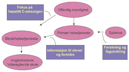 Helsevesenet står overfor en stor utfordring der offentlig myndighet må ta ansvaret for forebyggende rådgivning og kompetanseheving hos helsepersonell. Skolen blir en viktig arena for slik informasjon, og helsemyndigheter tilknyttet skolen blir viktige aktører. En mulig modell for samhandling mellom de ulike ansvarsområder er skissert i figur 1.