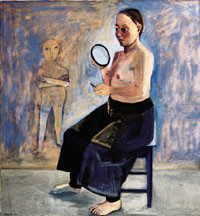 En av hennes motivkretser er imidlertid kunstnerens modell. Bildet som gjengis på forsiden har simpelthen tittelen Konstnären och hennes modell og er fra 1994. Den halvnakne kvinnen stirrende intenst inn i speilet, sittende i et nakent rom der et barn danner bakgrunnen, illustrerer jakten på det indre i eget liv og egen livshistorie, analysen av det selvopplevde, motiver som kan bli kunst.