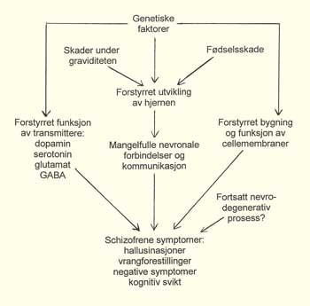 I denne oversikten har det ikke vært plass til å omtale alle nevrobiologiske funn som er gjort ved schizofreni, f.eks. innenfor områder som elektrofysiologi, energimetabolisme, blodgjennomstrømning i hjernen eller spesifikke enzymforstyrrelser. Det er lagt hovedvekt på å gi et oversiktsbilde av hjernens oppbygning hos schizofrene og av nevrokjemiske forstyrrelser som har eller kan tenkes å få terapeutiske konsekvenser. I figur 1 er det gitt en samlet skjematisk oversikt over de biologiske årsaksfaktorer som man antar gjør seg gjeldende ved utviklingen av schizofreni, hvilke virkninger de har, og hvordan de interagerer med hverandre.