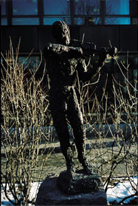 Utenfor biblioteket i Drammen står det en bronsefigur av en musiker. Skulptøren Nina Sundbye (f. 1944) har i dette arbeidet fra 1979 formidlet noe abstrakt – den svakt skjelvende tonen som formes av buestrøket mens kunstneren lytter, bortvendt, konsentrert, ikke i denne verden.