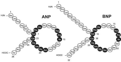 De natriuretiske peptider syntetiseres og lagres i hjertets myocytter som prohormoner, proANP og proBNP. Etter frigjøring fra myocyttene gjenfinnes de i plasma som aktivt hormon, ANP og BNP, og som de resterende deler av prohormonene, Nt-proANP og Nt-proBNP. Data tyder på at proBNP også sirkulerer som intakt prohormon (fig 2).