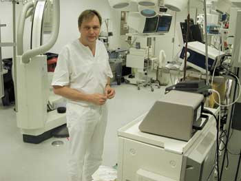 Senteret har tre behandlingslaboratorier. Et av dem er en kombinert operasjons- og angiografistue på 70 kvm. Tidsskriftet er tilskuer når en radiolog gjør angiografi på en pasient som er til kontroll etter å ha vært med i en forsøksprotokoll for bypassoperasjon på bankende hjerte, dvs. hjerteoperasjon uten å bli koblet til hjerte-lunge- maskin.