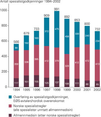 Totalt er kvinneandelen 37,2 % for alle spesialister godkjent etter norske spesialistregler i 2002 – 17,9 % for konverteringer. Hvis man kun tar dem som har fått sin første hovedspesialitet, er kvinneandelen 32,8 % inkludert konverterte (40,4 % for norske og 17,9 % for konverteringer). Det er imidlertid stor forskjell i andelen kvinner mellom spesialitetene. Spesielt i kirurgiske fag er kvinneandelen fortsatt lav.