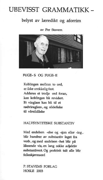 Professor emeritus Per Stavem, kriger, idrettsmann, blodforsker ved Rikshospitalet og hyppig bidragsyter i Tidsskriftet, har befridd en norskfilolog og språkfilosof fra et mangeårig opphold i skapet. Han har riktignok brutt seg ut fra tid til annen og vist seg i Tidsskriftet og lokalpressen. Tidsskriftets lesere fikk også en forsmak i jule-nummeret 2002. Men først med den blodferske samlingen Ubevisst grammatikk – belyst av læredikt og aforrim er skrittet tatt for alvor (1).