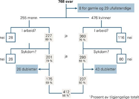 Av ca. 900 utdelte skjemaer ble 768 besvart (fig 1). Åtte svarere ble ekskludert fordi personen var over 67 år, og 29 skjemaer var så ufullstendig utfylt at også disse svarerne ble ekskludert. Av de gjenværende 731 var det 476 (65 %) kvinner og 255 (35 %) menn. Noen flere kvinner enn menn ble ekskludert fordi de ikke var i arbeid eller fordi årsaken til at de oppsøkte legekontoret viste seg å være rutineundersøkelser, helbredsattester og liknende. Ved opptellingen viste det seg også å være en del dubletter av personer som hadde oppsøkt kontoret flere ganger på grunn av samme lidelse og fylt ut skjemaet hver gang. Etter disse eksklusjonene stod vi igjen med 412 personer, 175 menn og 237 kvinner, for videre analyser. Gjennomsnittsalderen for kvinner og menn var henholdsvis 44 og 45 år.
