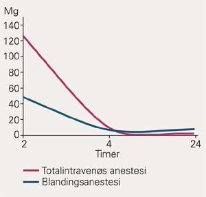 Når det gjaldt smertebehandling, fikk totalintravenøspasienter signifikant høyere dose av ketobemidon enn pasienter som fikk blandingsanestesi (gjennomsnitt 2,35 versus 5,43 mg/24 t, p < 0,004) (tab 1). Hovedvekten av medikasjonen lå innen de to første postoperative timene (fig 1). VAS-skåre viste ingen signifikante forskjeller for pasienter som fikk henholdsvis blandingsanestesi eller totalintravenøs anestesi etter 4 t (gjennomsnitt 2,6 versus 1,9, p > 0,2) og 24 t (gjennomsnitt 2,7 versus 3,2, p > 0,2). Innad i totalintravenøsgruppen var VAS-skåre signifikant høyere ved 24 t enn ved 4 t postoperativt (1,9 versus 3,2, p = 0,012).