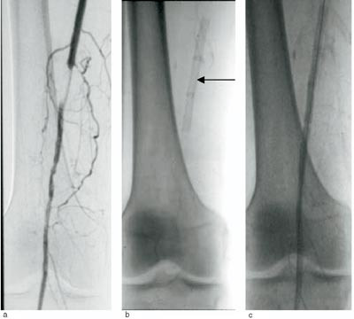 Percutaneous transluminal angioplasty (PTA) is increasingly used in the treatment of stenoses and short occlusions of the superficial femoral and proximal popliteal arteries. Routine treatment with arterial stents does not seem to improve the results compared to PTA without stent but the efficacy of stenting as a repair procedure of a failing PTA is not known.