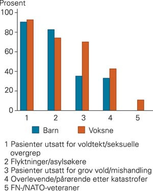 Figur 1 viser at man ved de fleste enhetene som inngikk i kartleggingen, behandlet personer som hadde vært utsatt for voldtekt/seksuelle overgrep og flyktninger. For disse gruppene var det små forskjeller mellom enhetene for barn/unge og enhetene for voksne. Enhetene innen psykisk helsevern for voksne behandlet imidlertid klart flere pasienter fra kategorien livstruende/grov vold (70 %) enn enhetene for barn/unge (36 %). 11 % av enhetene innen psykisk helsevern for voksne oppgav at de behandlet FN-/NATO-veteraner.