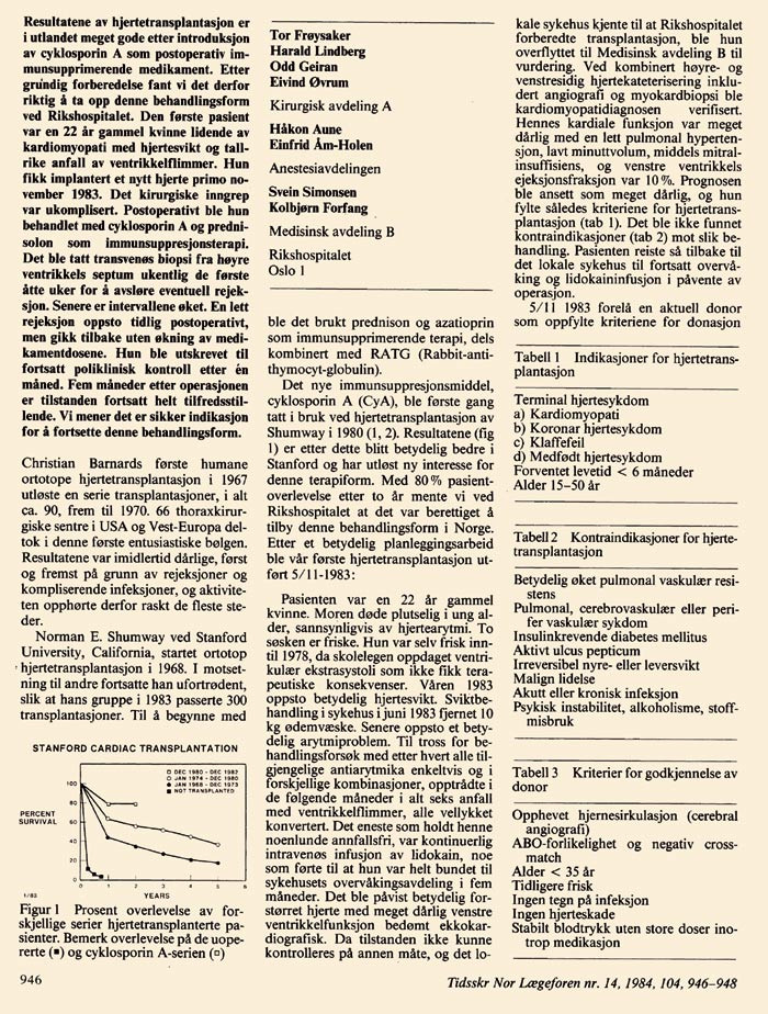 Tidligere i Tidsskriftet Første hjertetransplantasjon i Norge () sporsmal_grey_rgb Artikkel Valget falt på en 22 år gammel Trondheims-kvinne da det kirurgiske inngrepet fant sted i november 1983. Året etter beskrev de involverte legene denne medisinske milepælen for Tidsskriftets lesere: Kommentarer ( 0 ) Dette kommentarfeltet modereres, men kommentarer blir ikke redaksjonelt behandlet ut over å sikre at de følger retningslinjer for vårt kommentarfelt. Denne artikkelen ble publisert for mer enn 12 måneder siden, og vi har derfor stengt for nye kommentarer. Publisert: 23. oktober 2003 Utgave 20, 23. oktober 2003 Tidsskr Nor Lægeforen 23. oktober 2003 123 : 2984-6 Publisert: 23. oktober 2003 Utgave 20, 23. oktober 2003 Tidsskr Nor Lægeforen 2003 123 : 2984-6 PDF Får du ikke vist PDF-filen eller vil lagre filen, kan du høyreklikke på PDF-ikonet. Velg «Lagre mål/fil som..» og hent så opp PDF-filen i for eksempel Acrobat Reader. Skriv ut Anbefalte artikler