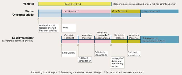 Pasientens omsorgsperiode er delt i tre forskjellige status, uavklart (status 1), avklart (status 2) og avsluttet (status 3) (e-fig1). Pasienten regnes som ventende inntil omsorgsperioden er avklart, dvs. inntil man ved sykehuset har bestemt seg for hvilken behandling pasienten skal ha, eller pasienten er ferdigbehandlet for sine plager, f.eks. operert. Dette medfører at pasienten registreres som fortsatt ventende selv om han kan ha vært til konsultasjon ved sykehuset opptil flere ganger, såfremt diagnostikk ikke er avklart og endelig behandling ikke iverksatt. Dette er forskjellig fra måten ventelistene ble registrert på før VENTSYS ble innført. Da var det tiden fra søknad ble mottatt og pasienten kom til første konsultasjon eller innleggelse, som utgjorde ventetiden. Dersom det så ble besluttet at pasienten måtte innlegges, ble det opprettet en ny venteliste for denne fasen.