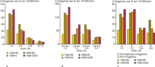 I aldersgruppen 3 – 4 år var det en betydelig økning i innleggelsesfrekvens fra 1984 – 85 til 1989 – 90 (p < 0,001), mens frekvensen sank fra 1989 – 90 til 1999 – 2000 (p < 0,05) (fig 1a). Også i denne aldersgruppen var innleggelsesfrekvensen høyere for gutter enn for jenter i alle perioder (p < 0,01 i alle periodene) (fig 1b). Tallet på førstegangsinnleggelser holdt seg stabilt gjennom hele perioden. Antall reinnleggelser økte fra den første til den andre perioden) (p < 0,01), men sank de neste årene tilbake til opprinnelig nivå (p < 0,01) (fig 1c).