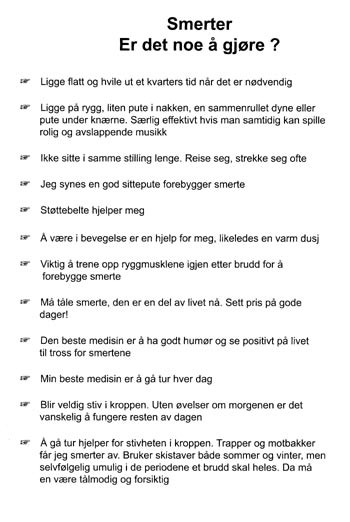 For oss kom det som en overraskelse at pasientene selv hadde utviklet så mange forskjellige måter å løse praktiske vanskeligheter på. Da vi startet arbeidet, trodde vi at helsepersonell i større grad måtte være bidragsytere til heftet. Pasienter som har måttet lære seg å leve med kompresjonsfraktur sitter således inne med stor grad av hverdagskompetanse.