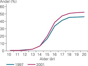 Median samleiedebutalder for aldersgruppen 18 – 24 år gikk for gutter ned fra 17,8 år til 17,3 år, og for jenter fra 17,0 år til 16,6 år i perioden 1997 til 2001.