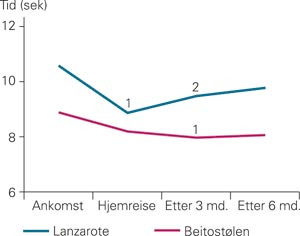 Sammenliknet med tilstanden ved ankomst til behandlingsstedet skåret gruppen på Lanzarote ved hjemreisen signifikant bedre på de fysiske testene, og bedringen holdt seg etter tre måneder (unntatt 20 meters gangtest) (fig 1 – 4). Etter seks måneder var det fortsatt bedring for utholdenhetstesten. De som ble behandlet på Beitostølen, presterte ved hjemreisen bedre resultater enn ved ankomsten til behandlingsstedet, men bedringen var ikke statistisk signifikant (fig 1 – 4). Etter tre måneder var det signifikant bedring også i gruppen behandlet på Beitostølen for alle fysiske parametere i forhold til utgangspunktet.