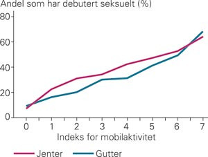 Det var små sammenhenger mellom samleiedebut og bruk av e-post og chat, men sterke sammenhenger for mobilbruk (tab 2). På dette grunnlaget laget vi en indeks for mobilaktivitet basert på alle de fire variablene, og med verdier fra 0 – 7. Jentene hadde litt høyere skåre på denne variabelen enn guttene (3,3 mot 3,0; p < 0,001). Det var nær lineær sammenheng mellom sannsynligheten for å ha hatt sitt første samleie og skåre på denne indeksen (fig 1).