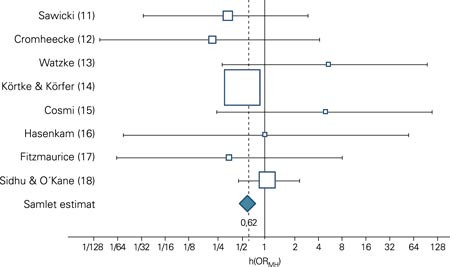OddsratioMH for kliniske begivenheter (store/fatale blødninger og tromboser) ORMH var 0,62 (95 % KI 0,429 – 0,895), z = –2,548 og p = 0,01. Studiene er Mantel-Haenszel-vektet (fig 1). Det ble utført en lik effekt-metaanalyse der det antas at den observerte forskjell fra studie til studie skyldes utvalgsvariasjon og at den underliggende forskjell i egenkontroll versus konvensjonell kontroll er den samme. Antakelsen ble testet ved en khikvadrattest for heterogenitet, α2 = 5,949; (p > 0,5), som ikke gir grunnlag for å forkaste denne.