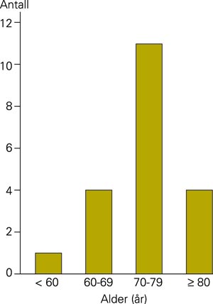 Diagnosen hjerneslag var stilt på grunnlag av kliniske funn og supplerende cerebral computertomografi som gav underdiagnosene hjerneblødning i tre tilfeller og hjerneinfarkt i de øvrige 17 tilfellene. Hjerneskaden var lokalisert til høyre hjernehalvdel hos ti pasienter, til venstre hos ni. Hos én var lokaliseringen usikker. Fire personer ble i samme tidsrom innlagt med TIA (transitorisk iskemisk anfall). Sju av pasientene var menn og 13 kvinner, og de fleste var i aldersgruppen 70 – 79 år (fig 1).
