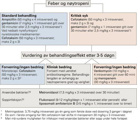 When a neutropenic patient becomes febrile, one should quickly do a thorough clinical examination, secure relevant microbiological samples, and start treatment with broad-spectrum antibiotics. As standard treatment for Norwegian children we recommend a combination of intravenous ampicillin and gentamicin. Patients who have clinical signs of septic shock should be given cefotaxime and gentamicin. If they get worse or show no signs of recovery after 3 to 5 days, a change to monotherapy with cefotaxime is recommended. Patients already treated with cefotaxime should be switched to meropenem, possibly in combination with vancomycin. Antifungal and/or anti-anaerobic treatment should also be considered.