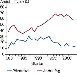 Figur 1 viser utviklingen over tid når det gjelder kanaler inn i studiet. Vi ser at det i hele perioden som studeres har vært uvanlig ikke å ha gått på privatskole eller ha begynt på annen høyere utdanning enn medisin. Betydningen av de forskjellige rekrutteringskanalene er imidlertid endret. Fra 1995, da opptakssystemet som begrenset anledningen til karakterforbedringer ble innført, sank andelen med privatskole og har avtatt ytterligere siden da. Andelen medisinstudenter som har vært registrert på andre fag, viser derimot en økende tendens – fra ca. 35 % i 1985 til nærmere 70 % fra midten av 1990-årene. I 2002, da opptaksgruppen med primærvitnemål og tilleggspoeng fra annen høyere utdanning falt bort, sank andelen med andre fag relativt kraftig, fra 70 % til i underkant av 60 %. Hovedtendensen i figur 1 er at den samlede byrden forbundet med å komme inn på medisin kan se ut til å være forholdsvis stabil, selv om den relative betydningen av de forskjellige rekrutteringskanaler er noe endret.