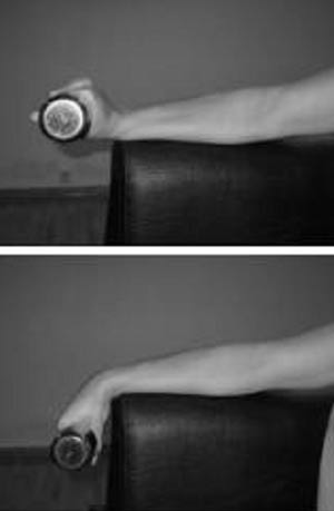 I begge grupper fikk pasientene triggerpunktsbehandling ukentlig i åtte uker, for at de skulle få mindre smerter og dermed øke etterlevelsen i forhold til det eksentriske treningsopplegget. Pasientene ble nøye instruert av fysioterapeut i eksentriske øvelser som skulle gjennomføres med affisert arm daglig hjemme i 24 uker. I uke 0 – 2 skulle de daglig gjennomføre aktiv håndleddsekstensjon, fleksjon, pronasjon, supinasjon og håndgrep uten motstand, med 100 repetisjoner. Progresjon i programmet ble ikke foretatt før disse bevegelsene kunne gjennomføres uten smerter. I uke 2 – 4 ble eksentriske øvelser for håndleddets ekstensormuskler introdusert – langsom håndleddsfleksjon mot motstand ble gjennomført som fire sett med 12 repetisjoner daglig (fig 1). Smerte opptil 4 cm på VAS-skalaen ble akseptert. I uke 4 – 6 ble hurtige konsentriske kontraksjoner for håndleddets ekstensormuskler lagt til de eksentriske øvelsene. I uke 6 – 24 ble programmet utvidet med plyometriske kontraksjoner. Ved studieavslutning benyttet de fleste en vektmotstand på 2 – 2,5 kg (1 – 6 kg).