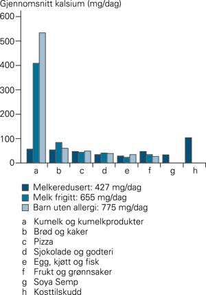 De barna som fikk melkeredusert kost, hadde et mye lavere kalsiuminntak enn barn uten allergi, noe som også er vist tidligere (6, 7, 9). Selv når kalsiumtilskudd ble regnet med, var inntaket lavt. I undersøkelsen til Tiainen og medarbeidere (7), derimot, fikk 17 av 18 barn kalsiumtilskudd, og inntaket var her på nivå med inntaket hos gruppen uten allergi. Kalsiuminntaket i «melk frigitt»-gruppen var litt lavere enn hos barn uten allergi, noe som kan skyldes et lavere forbruk av melk og melkeprodukter. Likevel tyder det på at barn som utvikler toleranse og kan innta melk og melkeprodukter i fri mengde, kan oppnå et kalsiuminntak på nivå med barn uten allergi. Barna uten allergi i vår studie hadde et lavere kalsiuminntak enn tilsvarende gruppe i andre studier (18, 19, 21, 22) og kan dermed ha hatt et lavere kalsiuminntak enn befolkningen for øvrig. Den reelle forskjellen mellom barn med og barn uten allergi kan være større enn funnet i denne undersøkelsen.