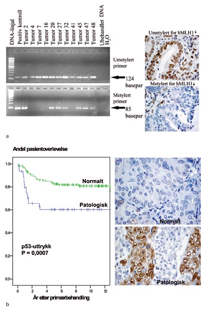 Kreft i livmorslimhinnen har generelt god prognose, med en samlet sykdomsspesifikk femårsoverlevelse på rundt 75 %. Dette skyldes blant annet at de fleste tilfellene blir oppdaget mens sykdommen er lokalisert i livmoren (FIGO-stadium I). For de fleste av disse pasientene vil kirurgi i form av hysterektomi med bilateral salpingooforektomi være tilstrekkelig behandling. Tumors infiltrasjonsdybde i myometriet, histologisk type og grad samt status for lymfeknuter i bekkenet og paraaortalt er med på å bestemme om pasienten skal anbefales strålebehandling i tillegg (15). For å få en bedre kartlegging av sykdomsutbredelsen har man i de senere år i økende grad tatt prøver systematisk fra lymfeknuter i bekkenet i forbindelse med primæroperasjon. Likevel vil man avstå fra dette hos mange pasienter med høy alder og ledsagende risikofaktorer, risikoen for operasjonsmorbiditet og -mortalitet må veies nøye mot den gode prognosen ved sykdommen. På bakgrunn av dette har man i en rekke studier sett på nytten av andre prognostiske markører i tumor for denne pasientgruppen. En rekke prognostiske markører er identifisert (fig 1b). Hormonreseptor- og DNA-ploiditetsundersøkelser i tumor inngår i dag som en del av rutinediagnostikken, da det er vist at disse har selvstendig prognostisk betydning. Immunhistokjemisk uttrykk av p53 i svulstvevet har også i flere studier vist seg å ha selvstendig prognostisk verdi (5, 15, 20).