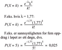 En viktig egenskap ved Poisson-fordelingen er at variansen kun avhenger av gjennomsnittlig hyppighet. Sannsynligheten for k oppdrag i løpet av ett døgn, gitt gjennomsnittshyppigheten λ (oppdrag per døgn) kan uttrykkes som: