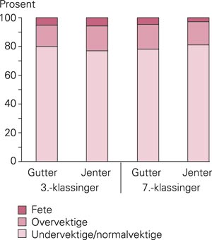 Resultater av fordeling av barna i forskjellig vektkategoriene ser vi i figur 1. Det var ingen signifikant forskjell mellom guttene på tvers av klassetrinnene. Forskjellen mellom jentene er imidlertid signifikant og viser nedgang av andelen fete fra 6 % i tredje klasse til 3 % i sjuende klasse. Samtidig må man være oppmerksom på at grenseverdier for fedme er mindre sikre enn referanseverdier for overvekt. Slik sett er samlet andel av overvektige/fete jenter 23 % i tredje klasse, mens andelen overvektige/fete jenter i sjuende klasse er 19 % (4 prosentpoeng lavere). Andelen undervektige var 3 % i begge aldersgrupper og for begge kjønn.