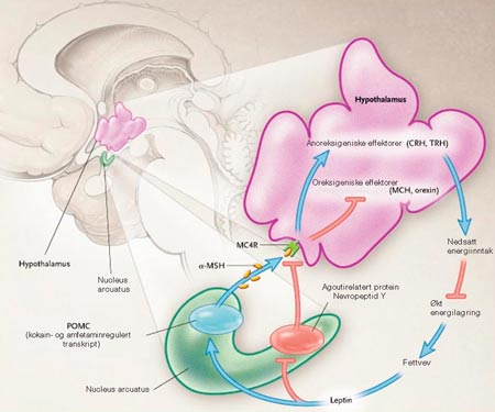 Siden 1997 er det rapportert fem gener hvor mutasjoner kan føre til monogene former for fedme hos menneske. Melanokortin-4-reseptor (MC4R) er den hyppigste av disse og finnes hos ca. 5 % av voksne med BMI > 40 kg/m² og barn med betydelig fedme (BMI > 3,5 standardavvik over gjennomsnittet) før ti års alder (10, 11). De fire andre genene hvor mutasjoner kan gi fedme er leptin, leptinreseptor, proopiomelanokortin (POMC) og prohormonkonvertase 1 (PC1). Disse deltar alle i appetittreguleringen i hypothalamus, i en rekke av reaksjoner som ofte kalles leptinaksen. Leptin produseres i hovedsak i fettvev og gir signal til sentralnervesystemet om kroppens energistatus. De resterende fire proteinene uttrykkes i hypothalamus (fig 1) (10). Normal fødselsvekt, men økt appetitt og matsøkende atferd allerede i de første levemånedene er felles for pasienter med mutasjon i ett av disse genene. Skader i hypothalamus kan gi liknende svikt i appetittreguleringen.
