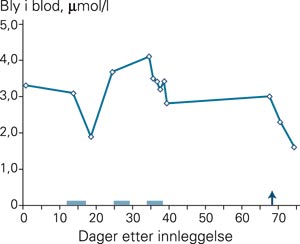 Det ble etter utskrivning gitt DMSA i samme dose som tidligere i en uke, og etter denne behandlingen var blykonsentrasjonen i blodet 2,14 µmol/l (fig 3). Etter utskrivning kom han raskt i arbeid og går til regelmessige kontroller. Hemoglobinverdien er stigende og leverenzymene er blitt normale. Ni måneder etter innleggelsen var blykonsentrasjonen i blodet 1,84 µmol/l. Eventuelle senskader etter blyforgiftningen vil bli kartlagt ved regelmessig oppfølging (5).