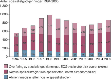 Antall godkjenninger ved overføring av spesialistgodkjenning fra Norden/EØS/EU har vært relativt stabilt de siste fem år, et snitt på 245 per år. Økningen til 288 i 2005 skyldes konverteringer fra de ti nye EU-landene. Totalt er det i 2005 overført 57 spesialistgodkjenninger fra sju av de ti nye EU-landene. De fleste overføringene fra disse ti landene er fra Litauen (18), Polen (17) og Ungarn (7). Spesialistgodkjenning etter norske regler, unntatt allmennmedisin, viser et snitt på 453 de siste fem år, med 490 i 2005. Dette er en klart økende tendens.