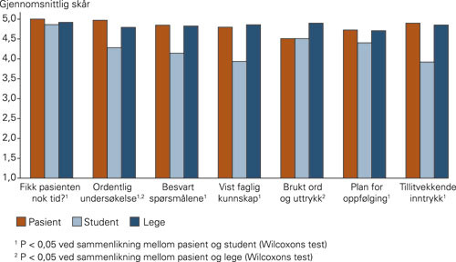Vi undersøkte samsvaret mellom evalueringene fra pasientene, studentenes selvevaluering og veileders vurdering på de samme områdene (fig 1). Veileder og pasient vurderte studenten likt på fem av sju temaer. Veileder ga høyere skår på spørsmålet om studenten hadde brukt vanskelige ord og uttrykk (p < 0,01), og ga lavere skår på spørsmålet om studenten hadde gjort en ordentlig undersøkelse av pasienten (p = 0,01). Studentene ga gjennomgående en lavere vurdering av sine egne konsultasjoner enn pasientene, med signifikant forskjell på alle områder bortsett fra spørsmålet om vanskelige ord og uttrykk.