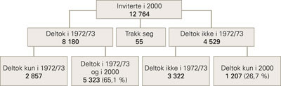 Ved helseundersøkelsen i 1972/73 møtte 17 964 menn av 30 025 inviterte (tab 1). I alt 12 765 menn ble invitert til ny helseundersøkelse – Oslo II – i 2000 (fig 1), hvorav 6 586 deltok. 55 personer trakk seg senere. Deres data er slettet og blodprøvene kastet. Av de 6 530 deltakerne hadde 5 323 (82 %) deltatt i Oslo-undersøkelsen 1972/73. Fremmøteprosenten blant dem som hadde møtt tidligere, var 65. De som møtte til begge helseundersøkelsene, utgjorde 82 % av deltakerne i Oslo II. Fremmøteprosenten var 51 totalt. Kriteriet for å bli definert som deltaker var at blodtrykket var målt.